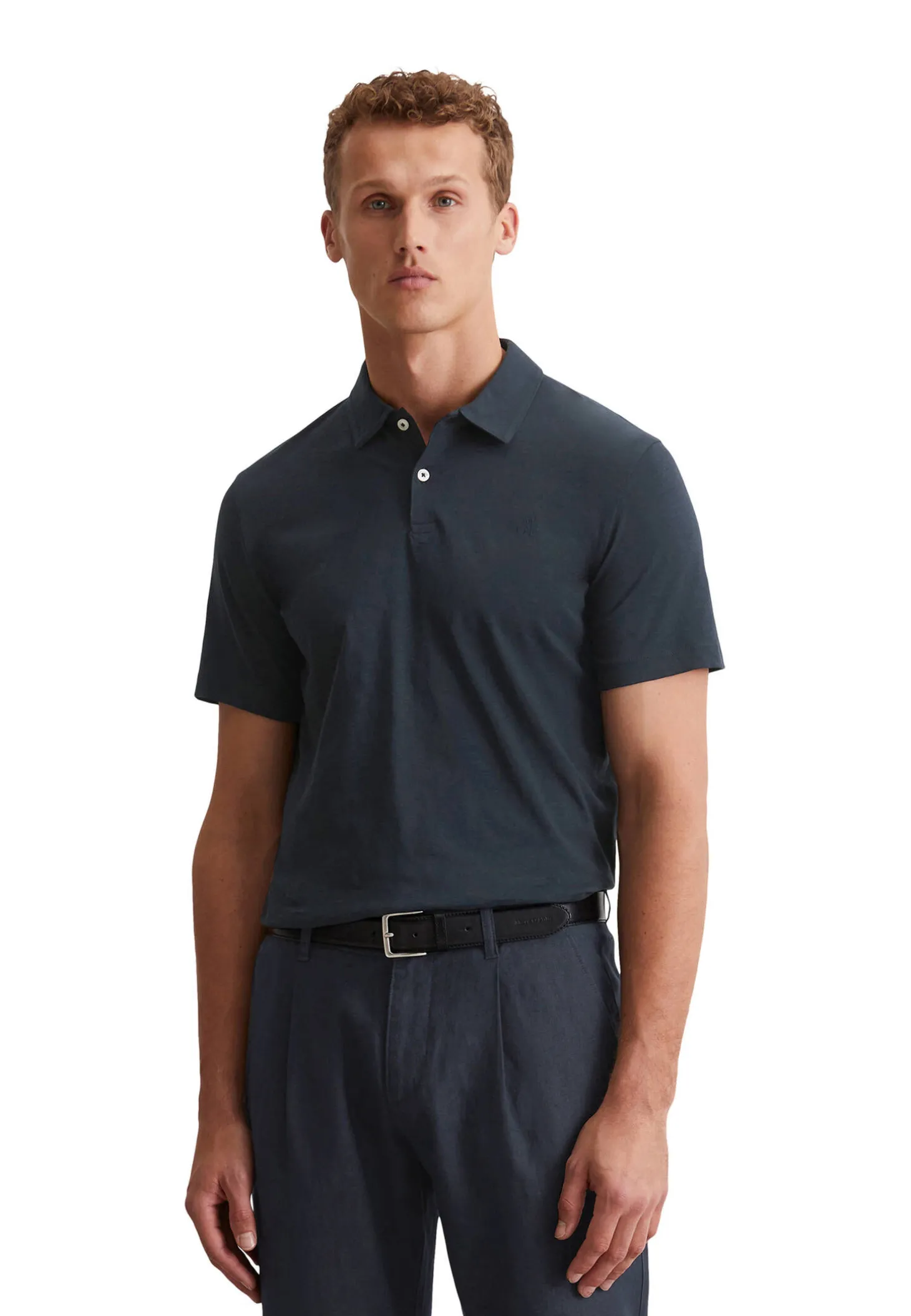 Das Marc O´Polo Poloshirt aus Bio-Baumwolljersey überzeugt durch feine Details wie den schmalen Kragen, die kurze Knopfleiste und die dezente Logo-Stickerei.