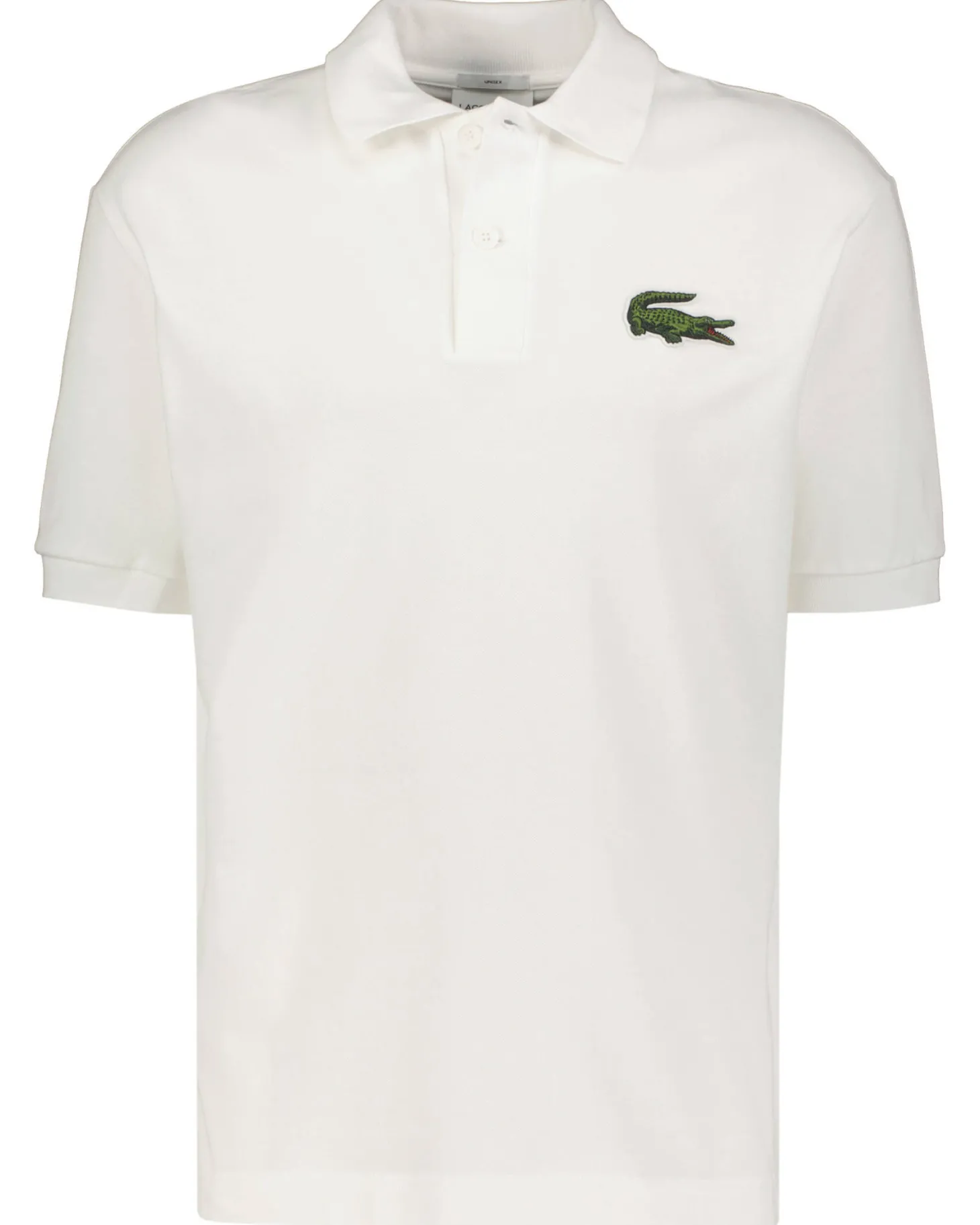 Lacoste präsentiert das locker geschnittene Poloshirt mit flachem Polokragen und etwas größerer Krokodil-Applikation.