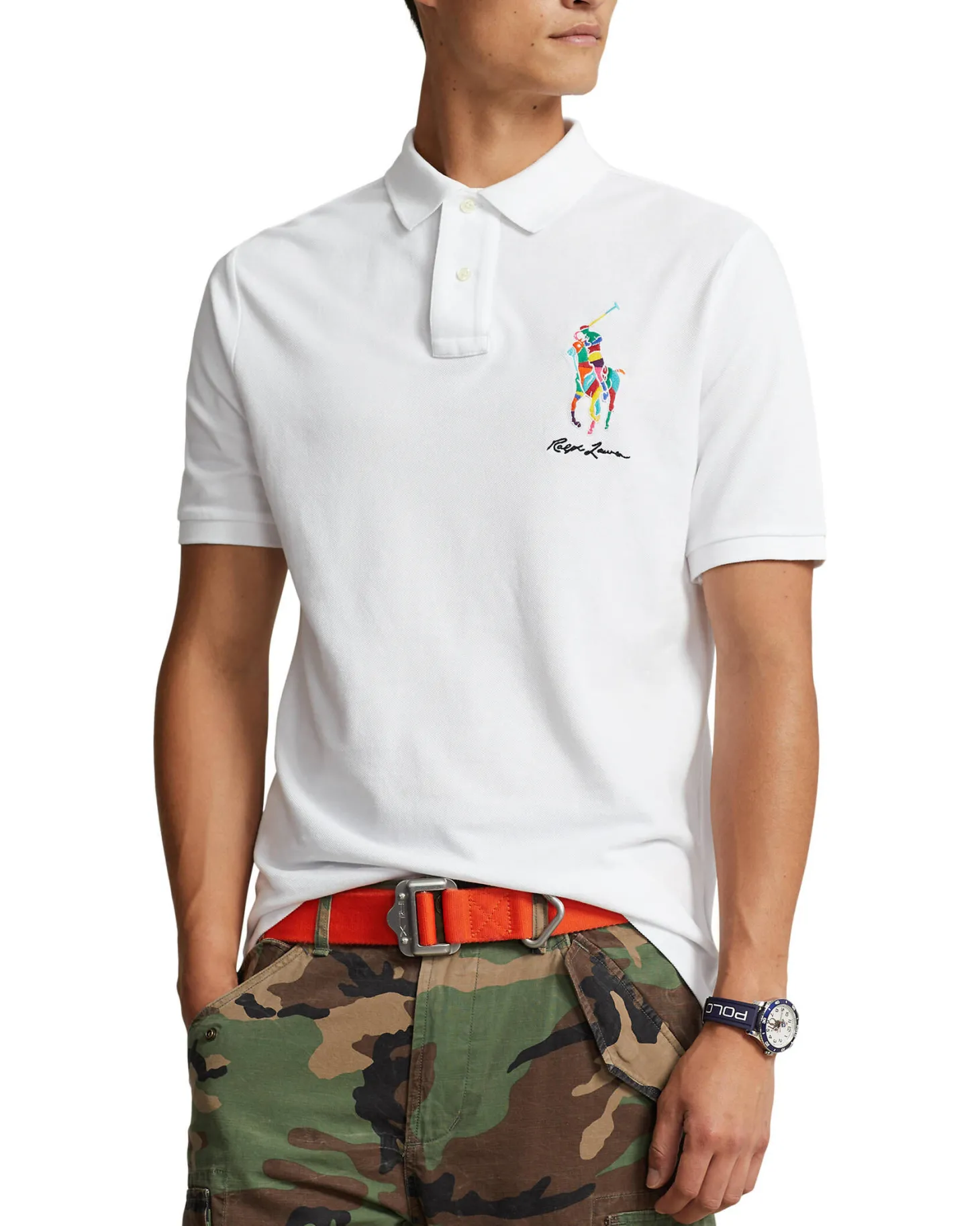 - Mehrfarbige Big-Pony-Stickerei auf Brusthöhe