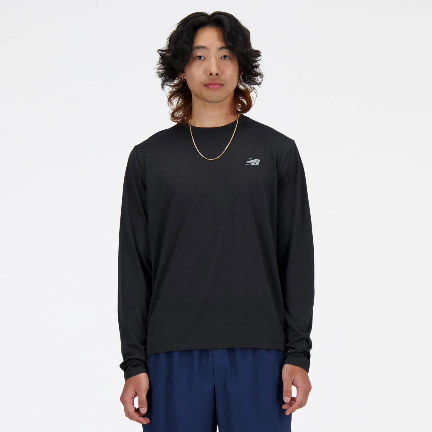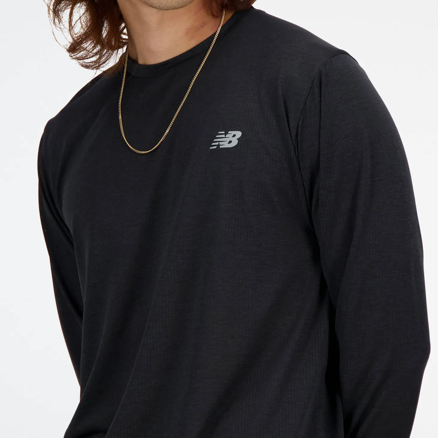 Funktionales Sportshirt von New Balance mit langen Ärmeln und Logo auf Brusthöhe.