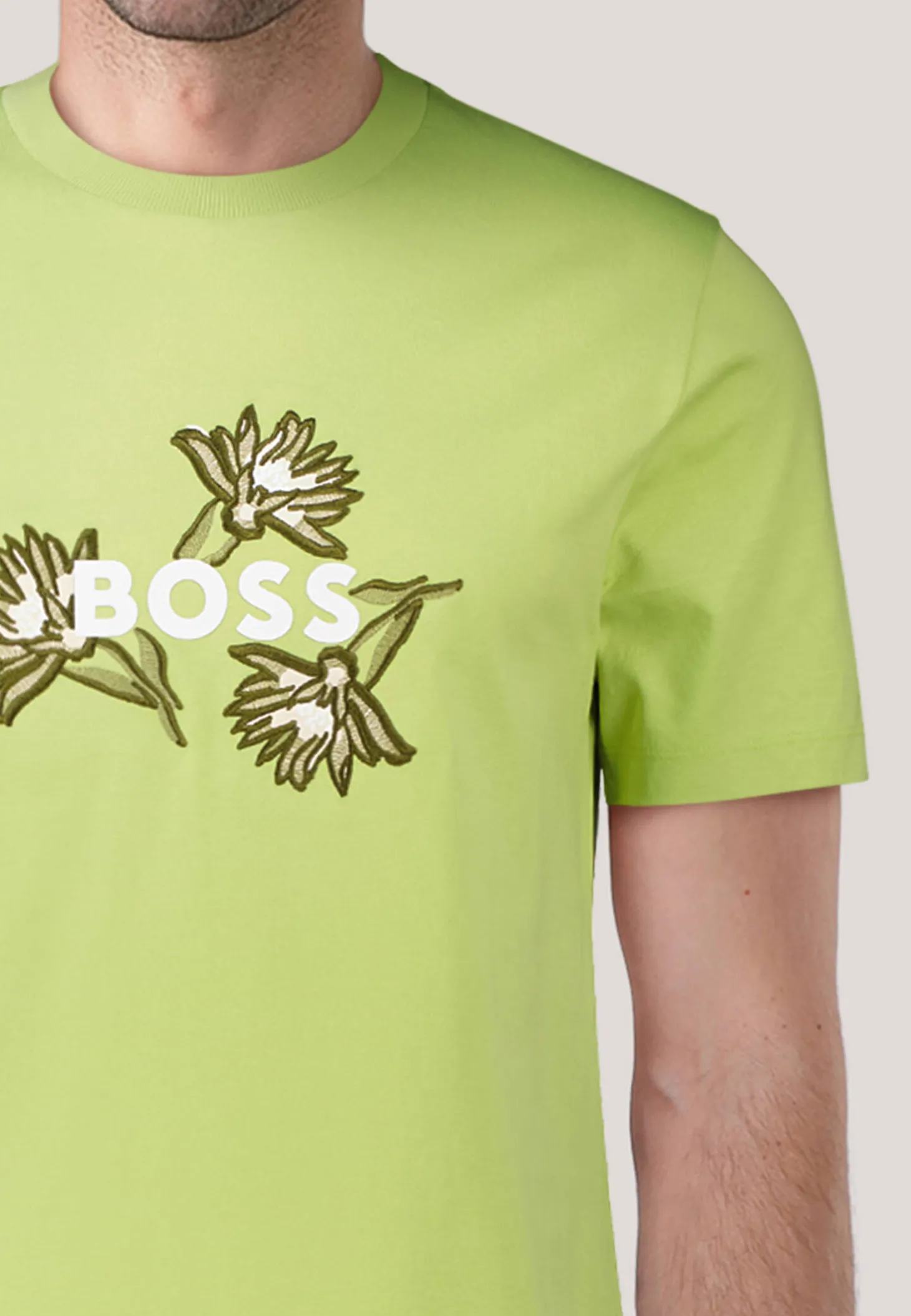 - Gestickte Blüten und gummierter BOSS-Schriftzug auf der Vorderseite