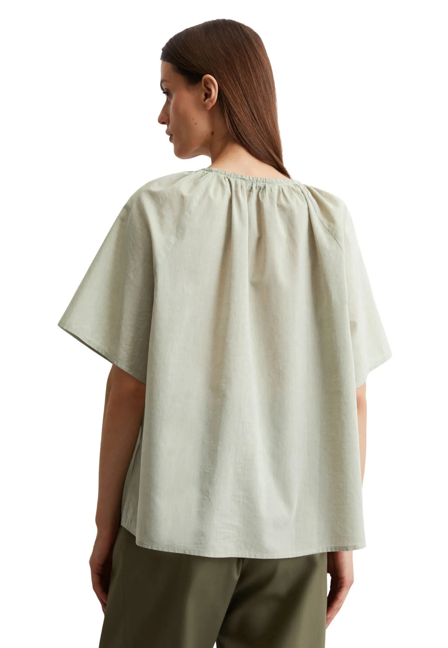 Leichte Baumwollbluse in hochwertiger, leichter Chambray-Qualität mit gerafftem Rundhalsausschnitt, mit Bindebändern.