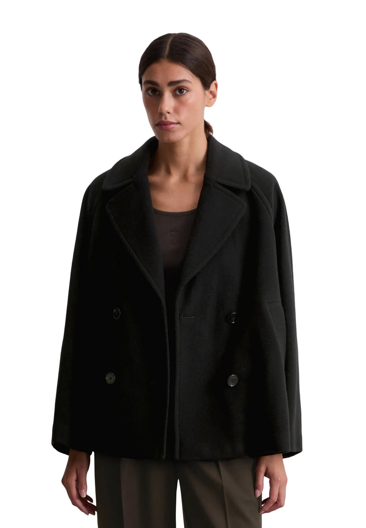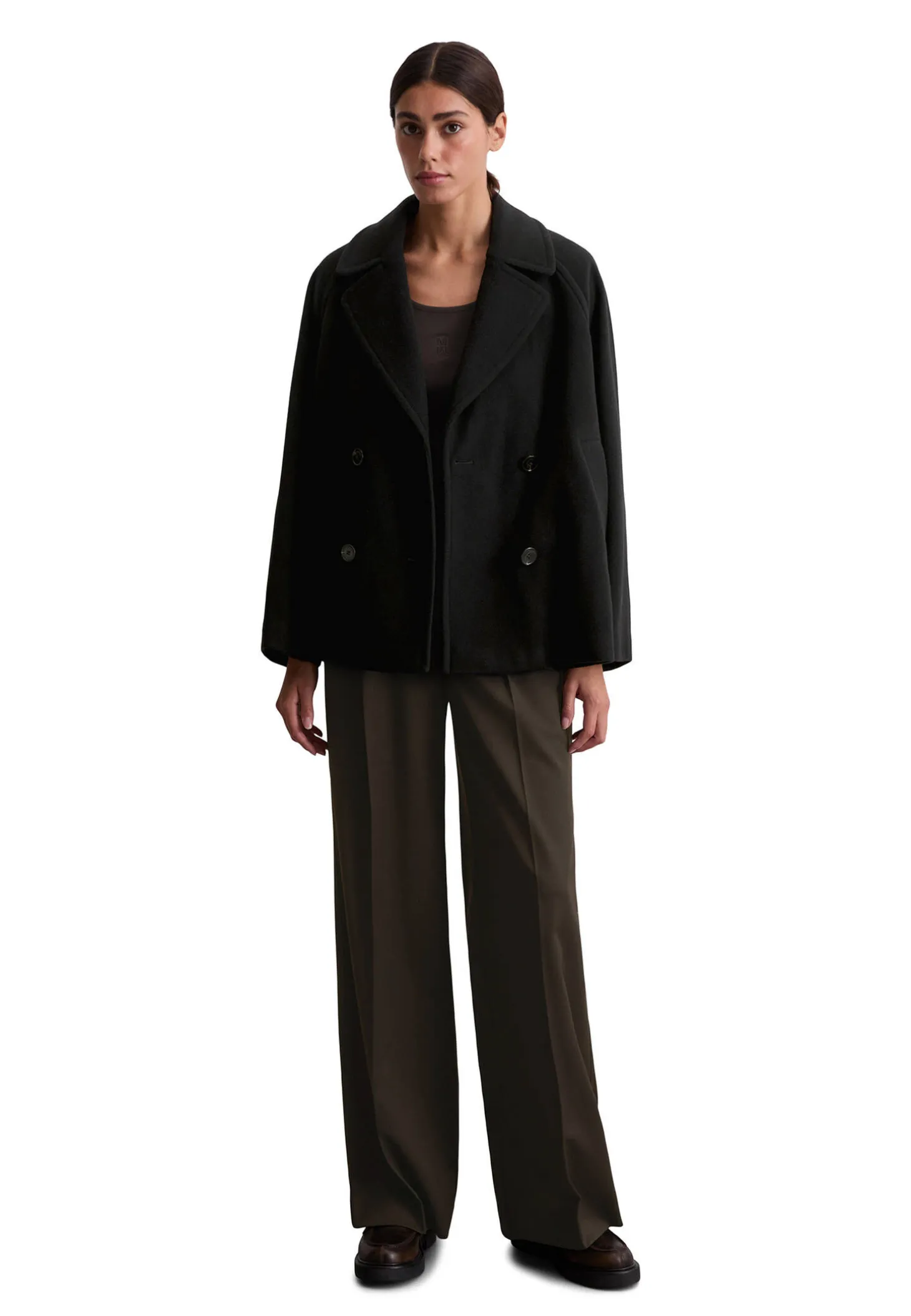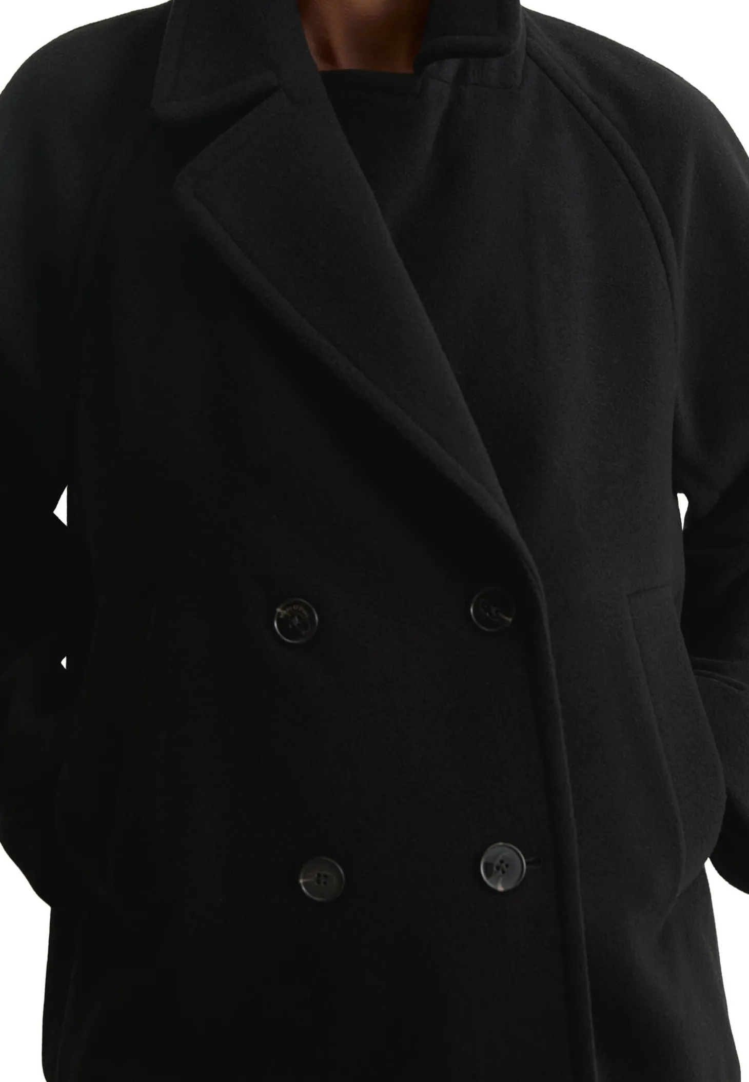 - Zweireihige Silhouette mit fallendem Revers und Knöpfen in Hornoptik