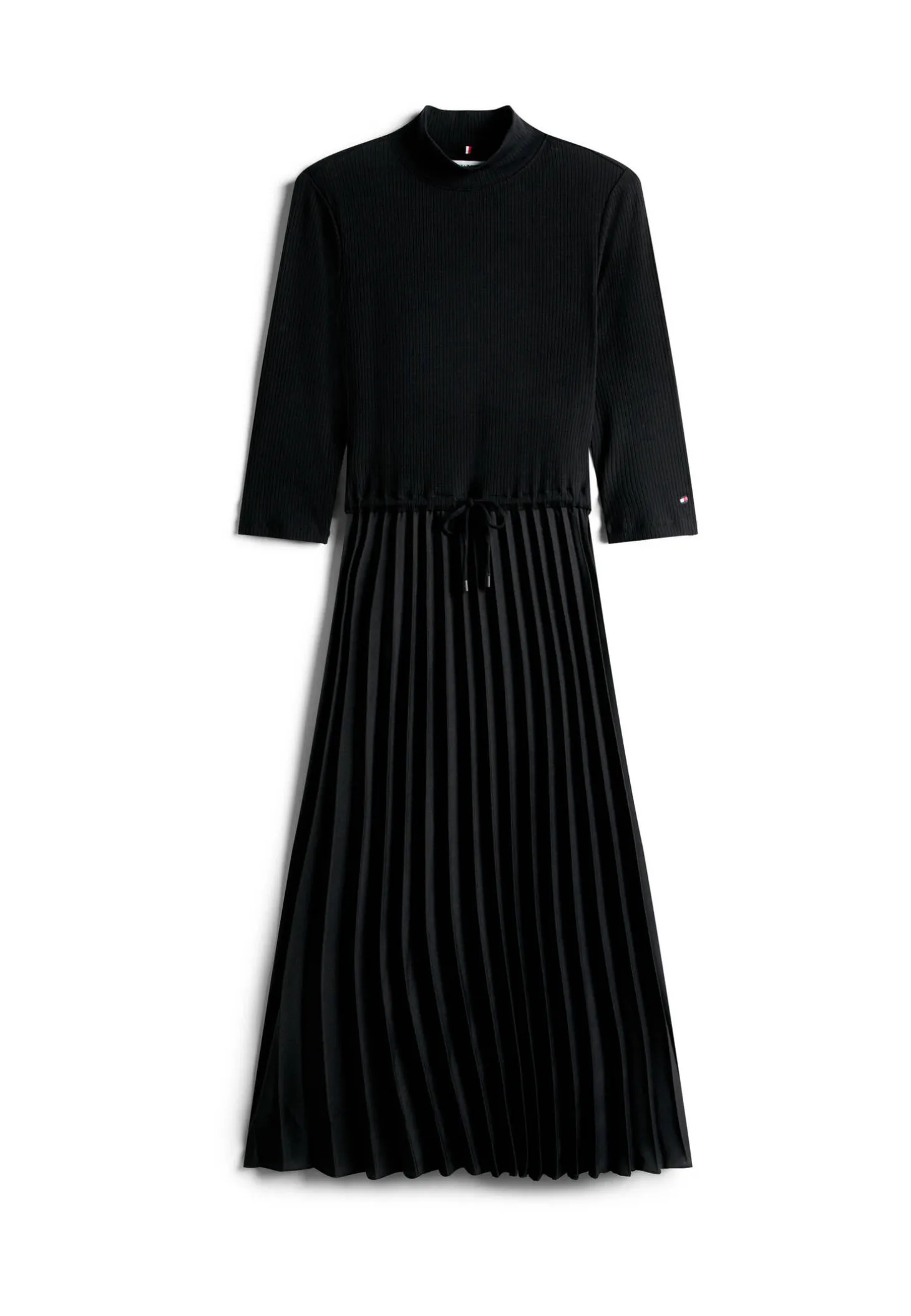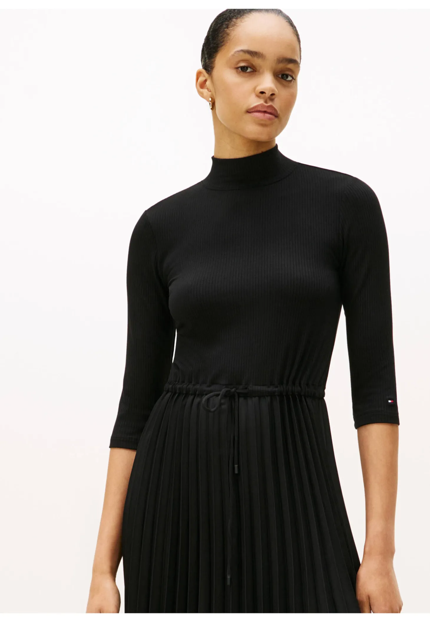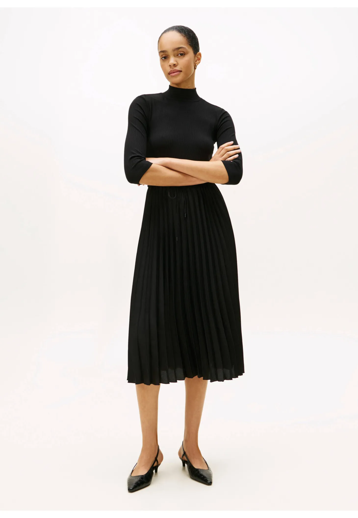 Dieses Midikleid kombiniert ein geripptes Slim Fit Top mit einem weich fließenden, plissierten Rock und erzeugt so eine schmeichelhafte Fit-and-Flare-Silhouette mit spannendem Strukturkontrast.