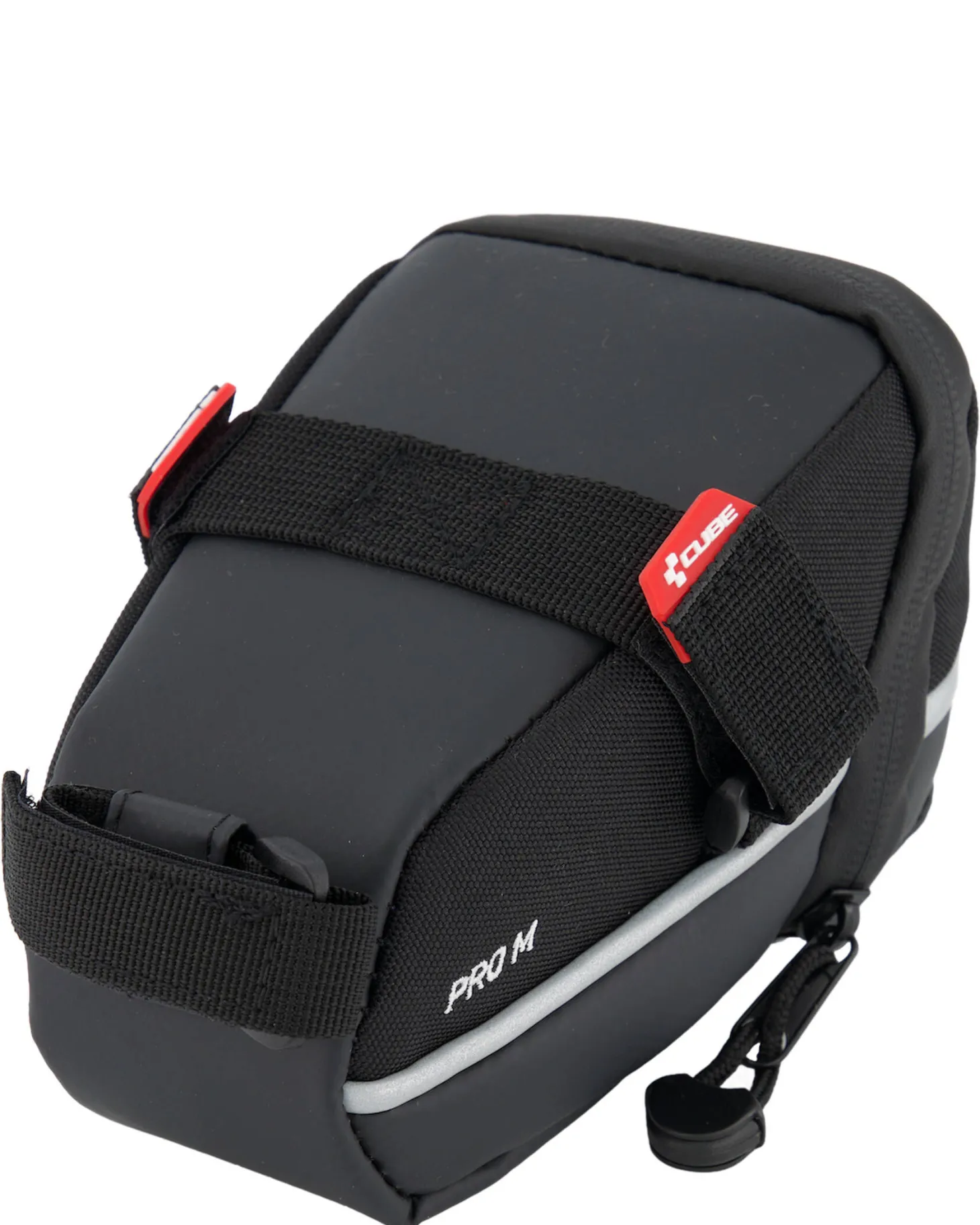 Die Pro S Satteltasche von Cube lässt sich ganz unkompliziert per Klettverschluss befestigen und ist mit einem wasserabweisenden Reißverschluss sowie einem praktischen Rücklichthalter ausgestattet.