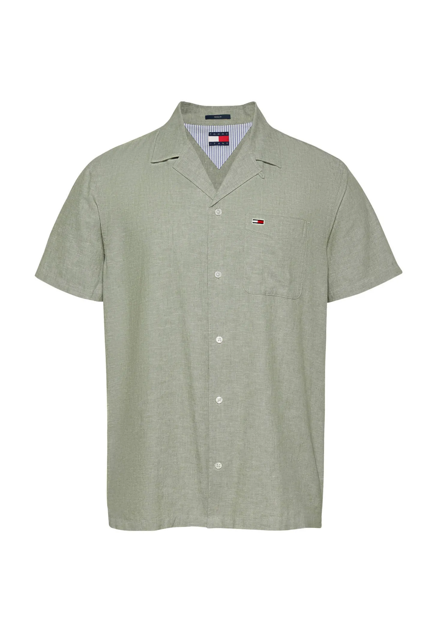 Das kurzärmelige Hemd von Tommy Jeans ist aus einem leichten Baumwolle-Leinenmix gefertigt, der sich bei warmem Wetter super angenehm trägt.
