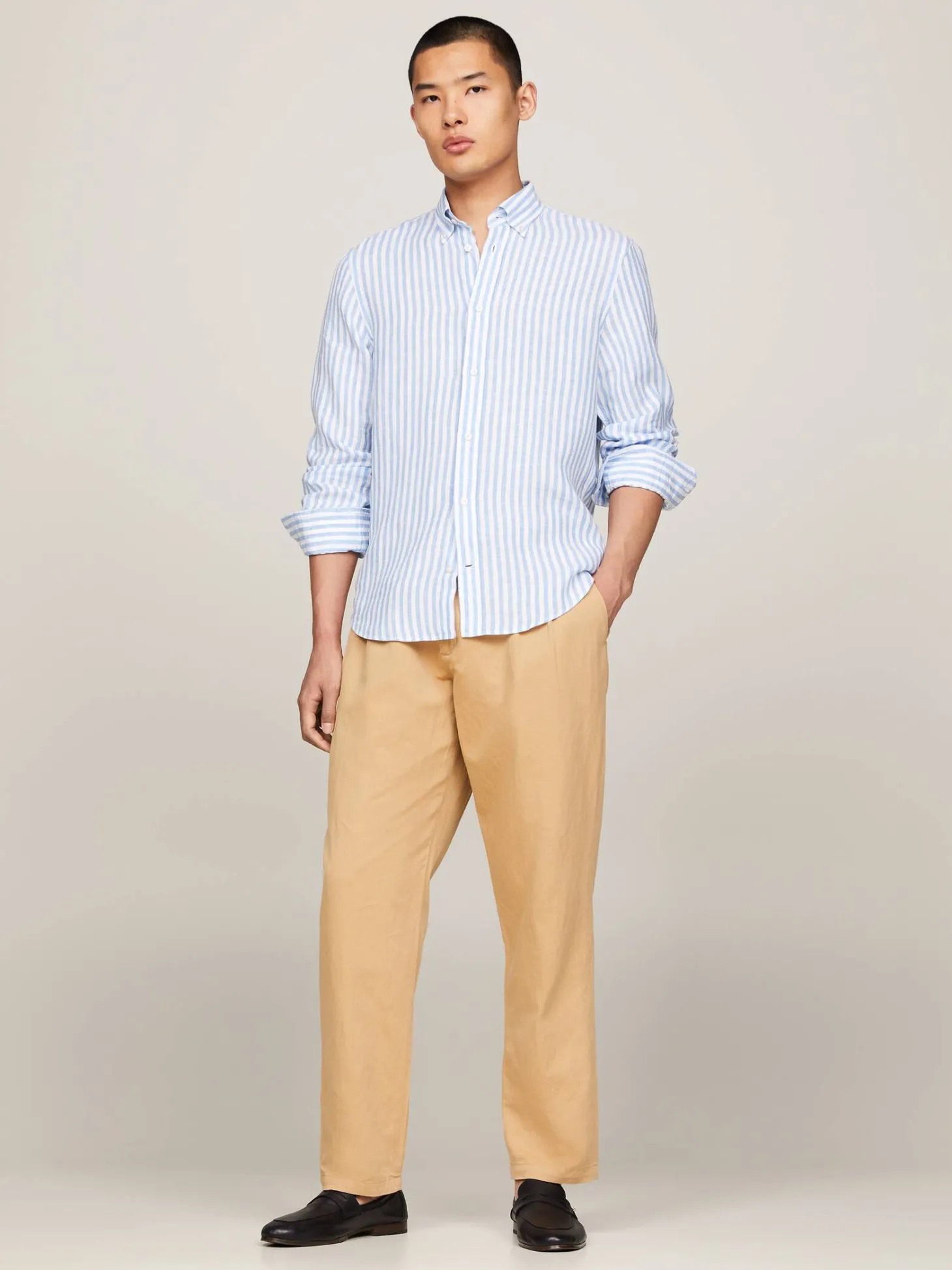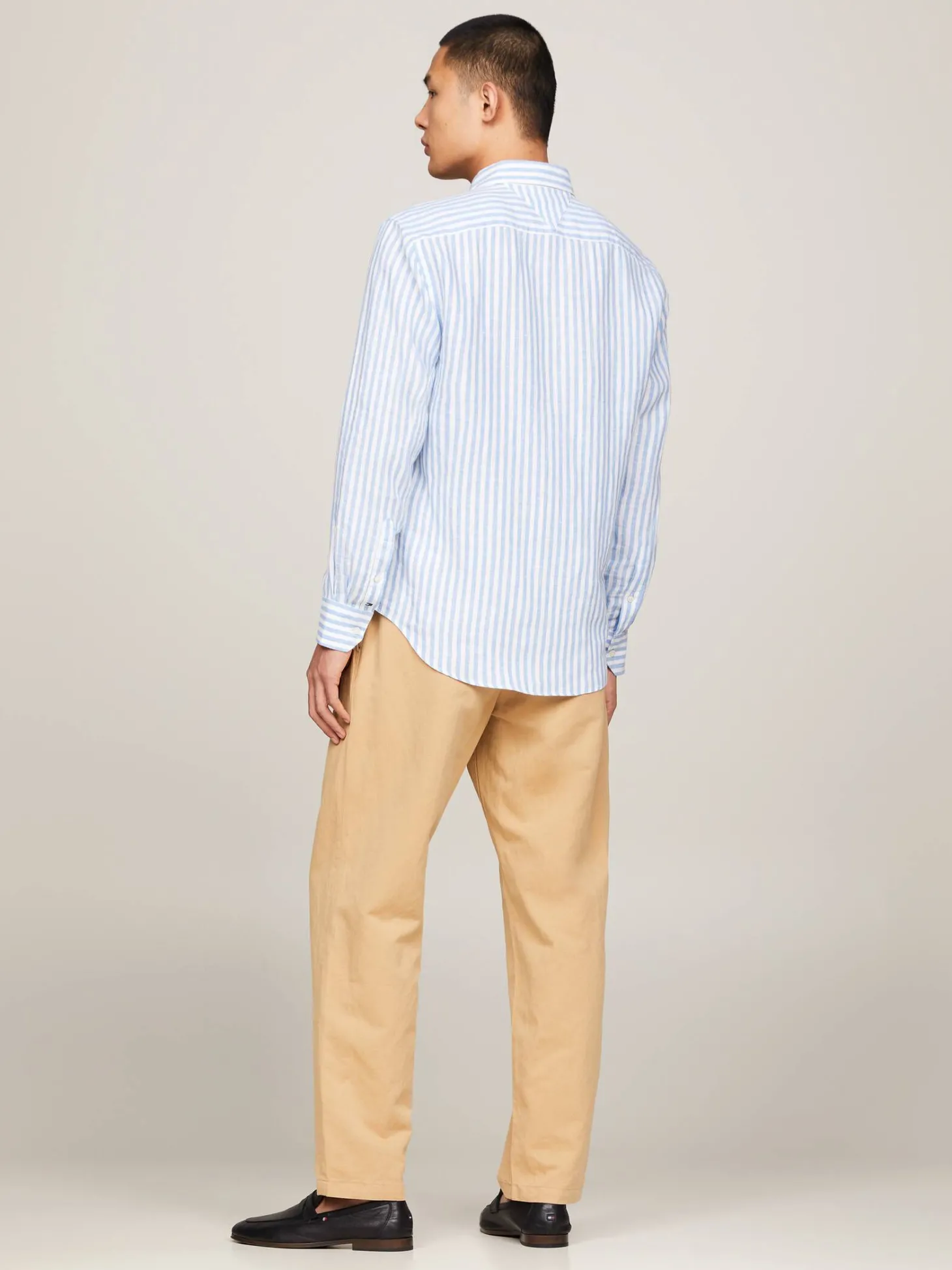 Gestreiftes Leinenhemd von Tommy Hilfiger mit Button-down-Kragen und verstellbaren Ärmelmanschetten.