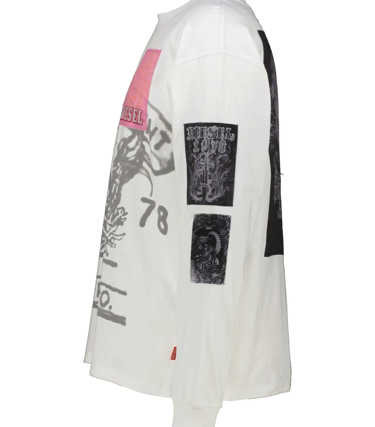 - Offenkantige Transferdruck-Patches mit ausgefransten Fäden