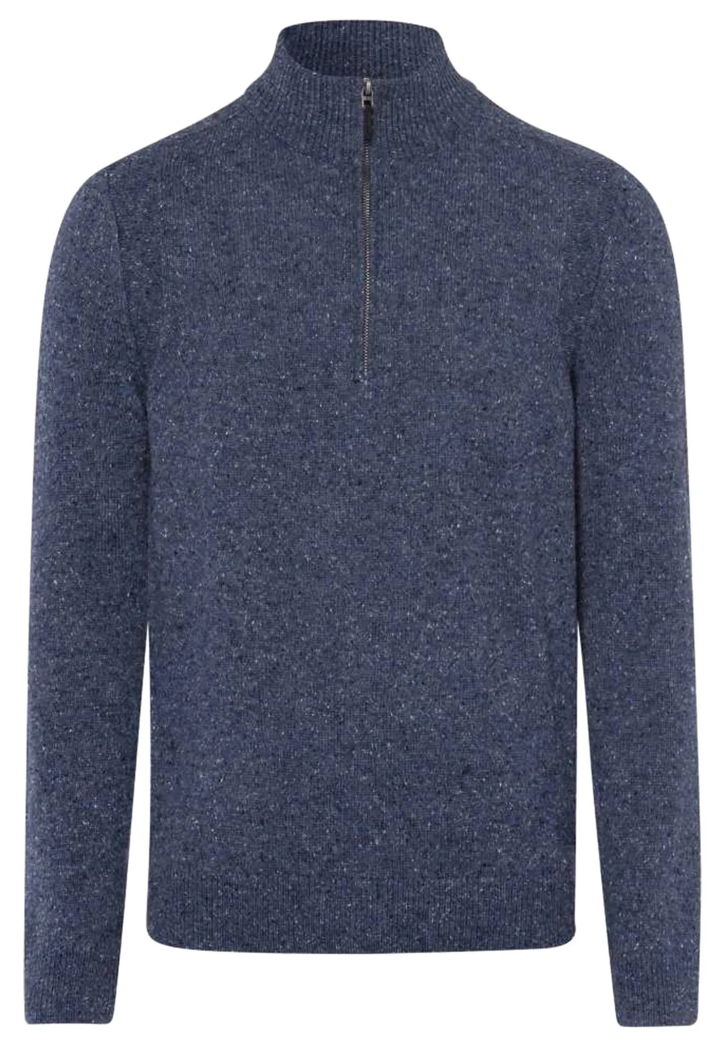 Dieser gerade geschnittene Herrenpullover besticht durch einen modernen Troyerkragen mit Reißverschluss und eine herbstliche Tweed-Optik.