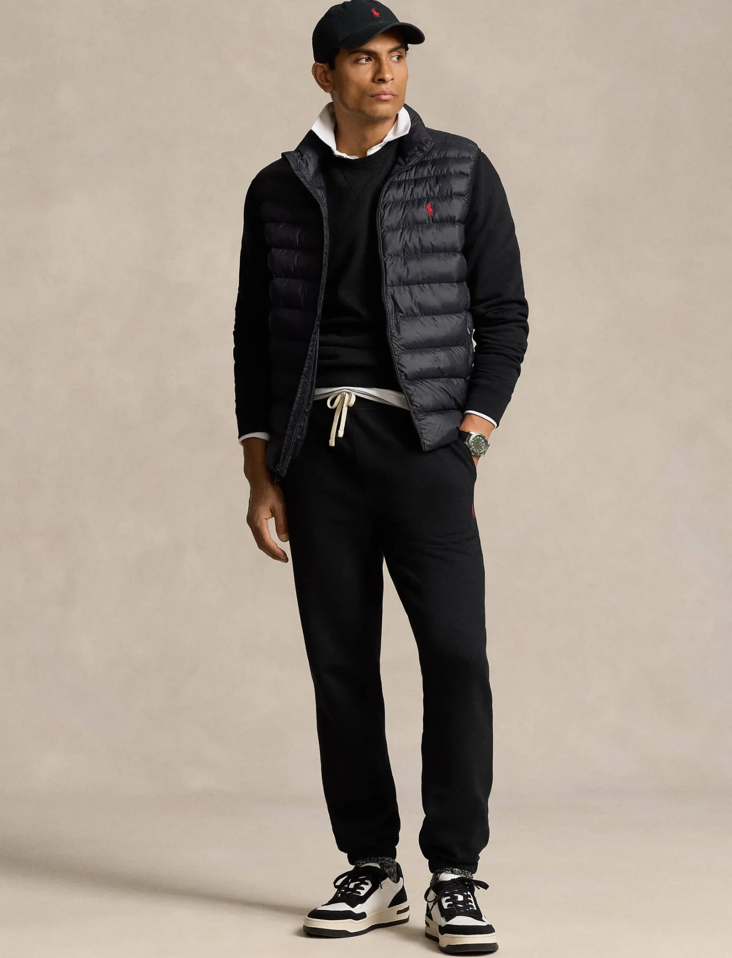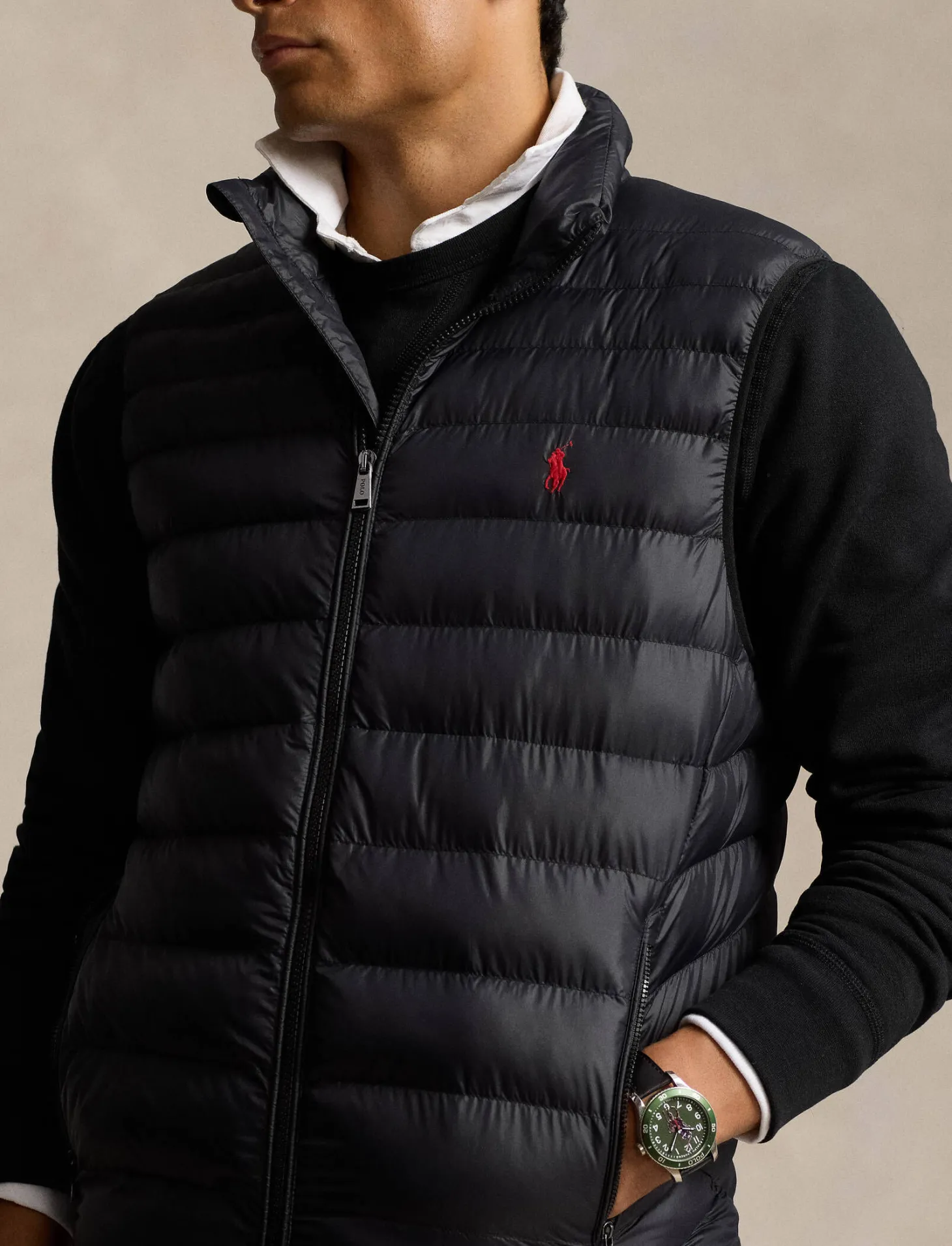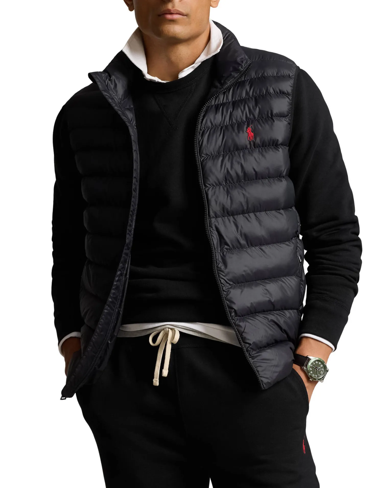 Die klassische Steppweste von Polo Ralph Lauren ist in der Übergangszeit vielseitig einsetzbar und in der eigenen Seitentasche verstaubar.