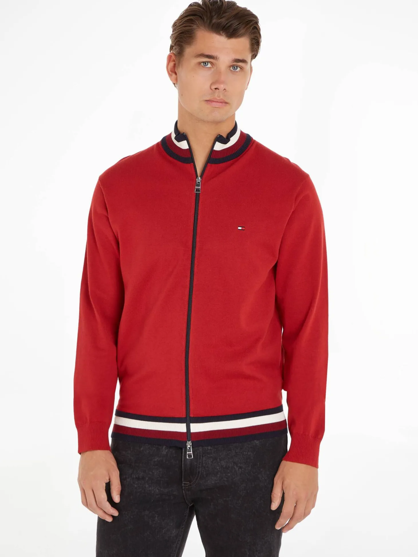 Die klassisch sportive Strickjacke von Tommy Hilfiger kann vielseitig mit legeren Casual Outfits kombiniert werden.