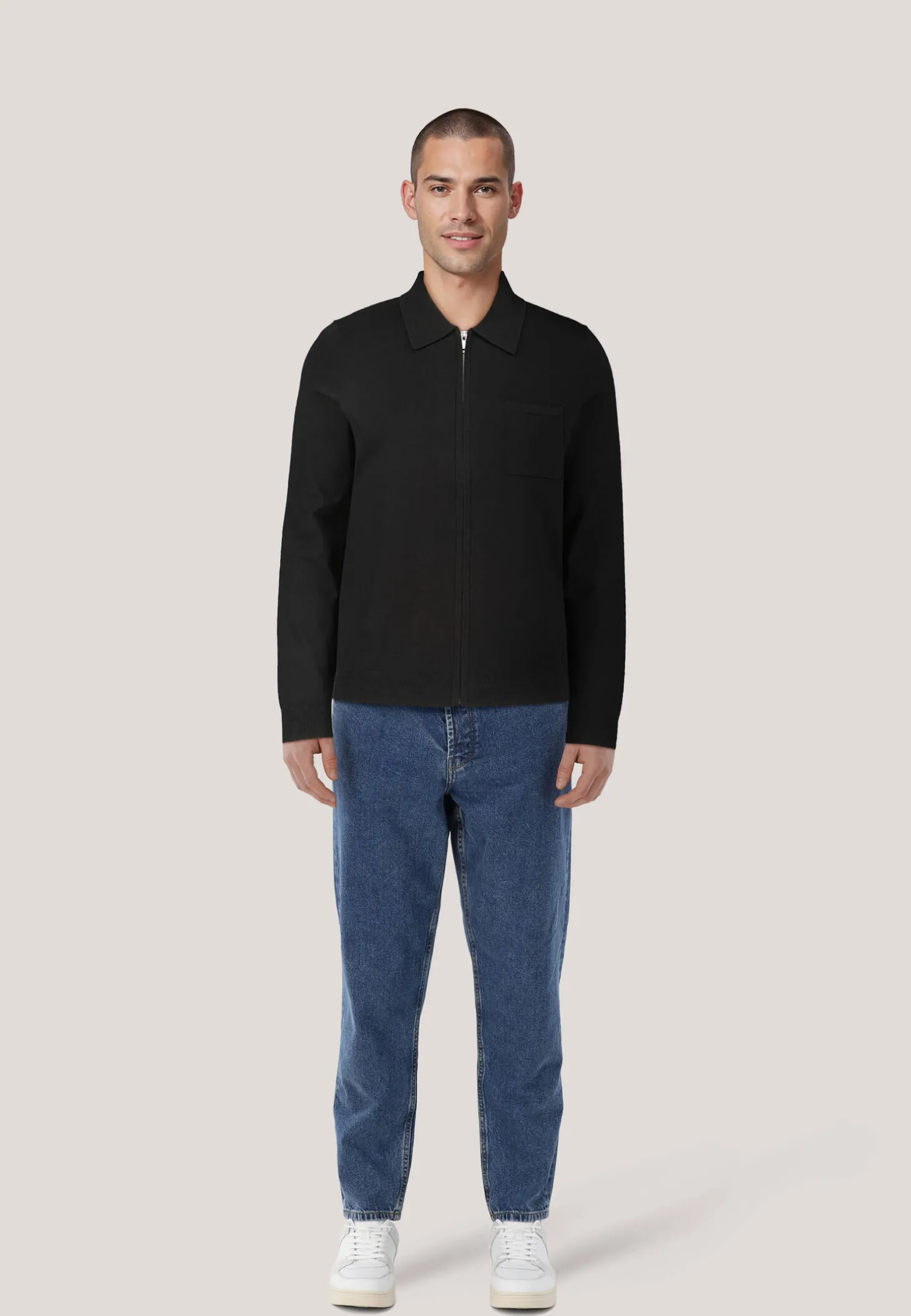- Fein gerippter Kragen, Saum und Ärmelbündchen