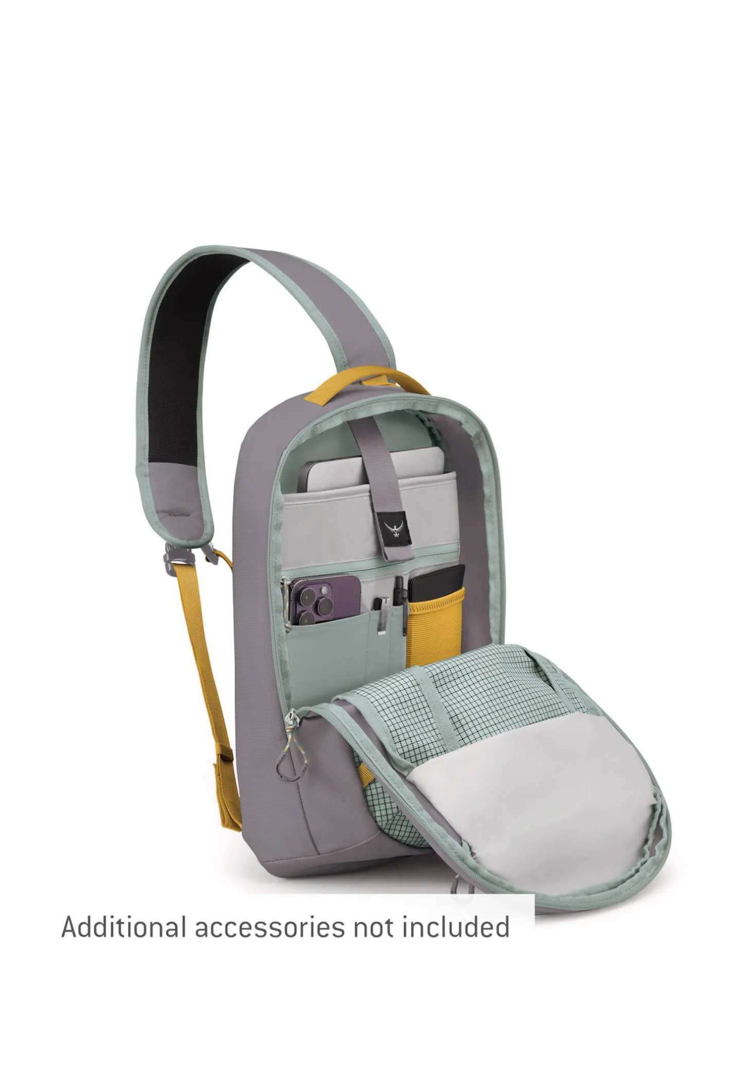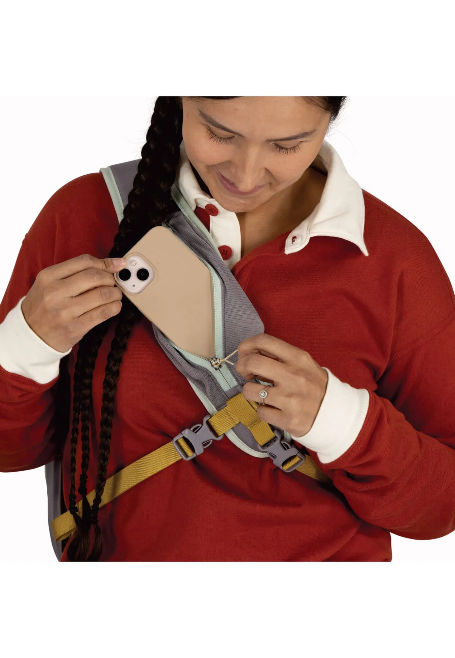 - Smartphone-Fach aus Mesh mit Reißverschluss am Schultergurt